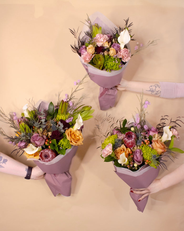 Fernseed's Valentine's Day Collection features stunning blooms in a color palette of rich plum, bright lavender, muted pink and mauve, and vibrant lime using roses, lisianthus, protea, carnations, eryngium, calla lilies, and more.