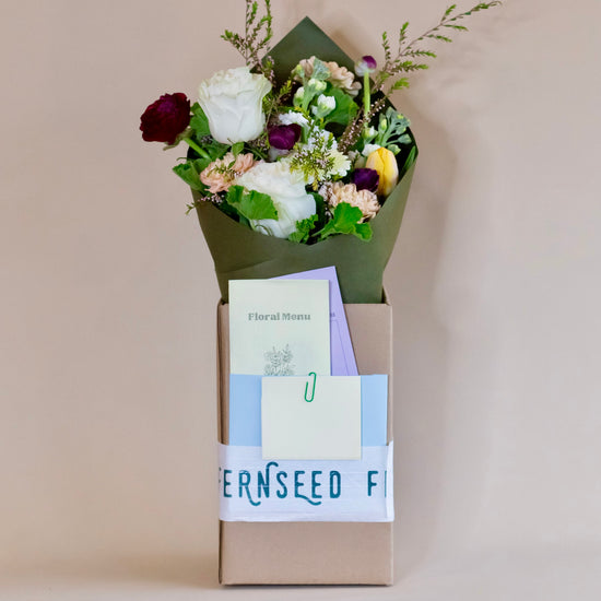 Wrapped arrangements arrive in a tall delivery box, designed to keep flowers upright and protected from damage.